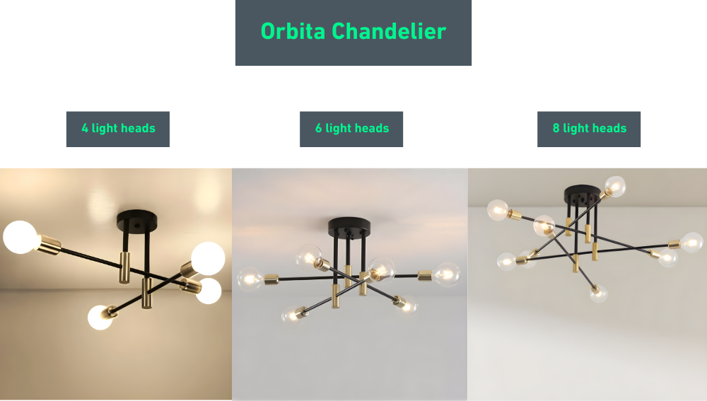 Transform multiple rooms of your home with the ORBITA chandelier, enhancing the atmosphere with its radiant presence. Tailor your lighting experience by selecting from our versatile range of configurations, available with 4, 6, or 8 light heads. This customization empowers you to adjust the number of bulbs to your liking, providing flexibility in illuminating your space with a personalized touch.