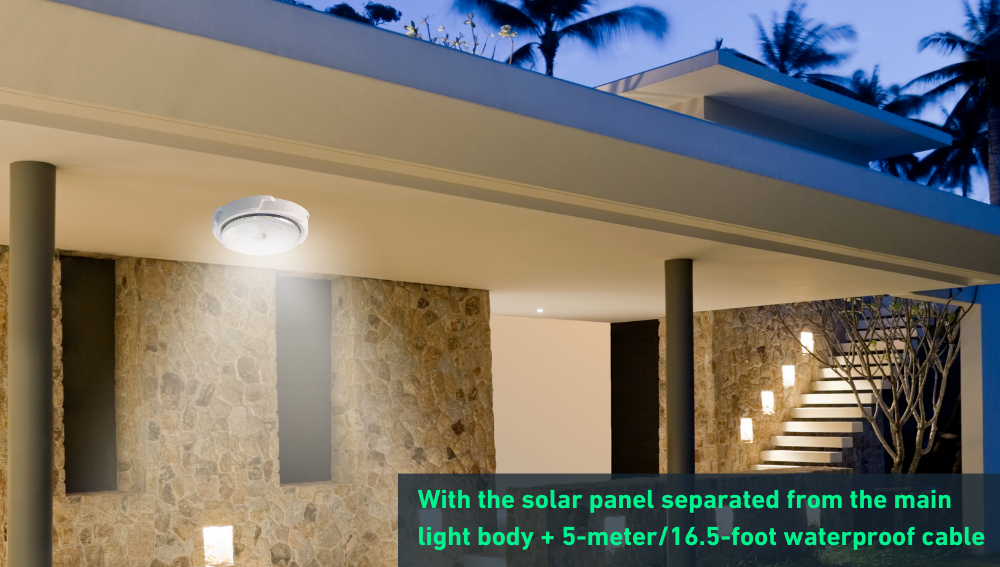 Unlike traditional solar lights, we've revolutionized installation. With the solar panel separated from the main light body and a generous 5-meter/16.5-foot waterproof cable, flexibility is at your fingertips. Whether illuminating your indoor or outdoor, you're in control. Choose to install it on the ceiling, wall, or let it dangle as a pendant light.